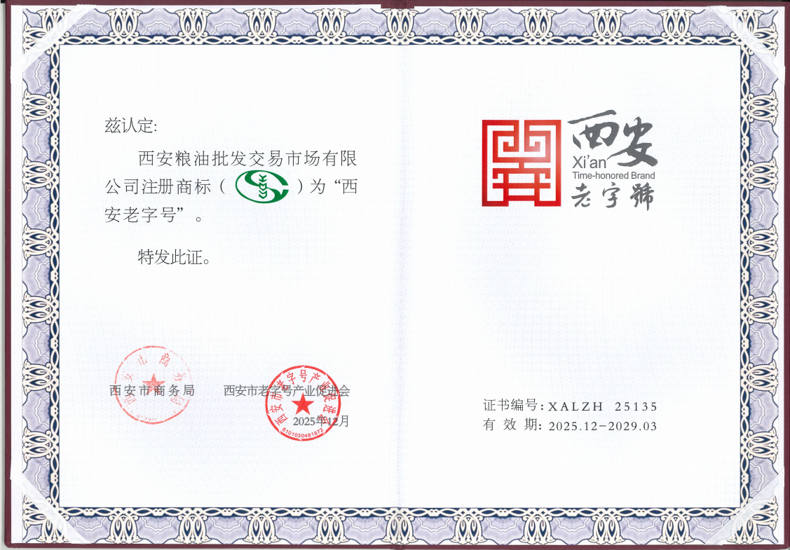 近日,西安市商務(wù)局正式公布第三批“西安老字號”認(rèn)定名單,西安糧油批發(fā)交易市場憑借深厚的文化積淀和卓越的行業(yè)影響力,成功入選,被授予“西安老字號”榮譽(yù)稱號。這一殊榮不僅是對市場三十年來堅(jiān)守品質(zhì)、服務(wù)民生的充分肯定,也標(biāo)志著其品牌價(jià)值與文化內(nèi)涵邁上了新臺階。